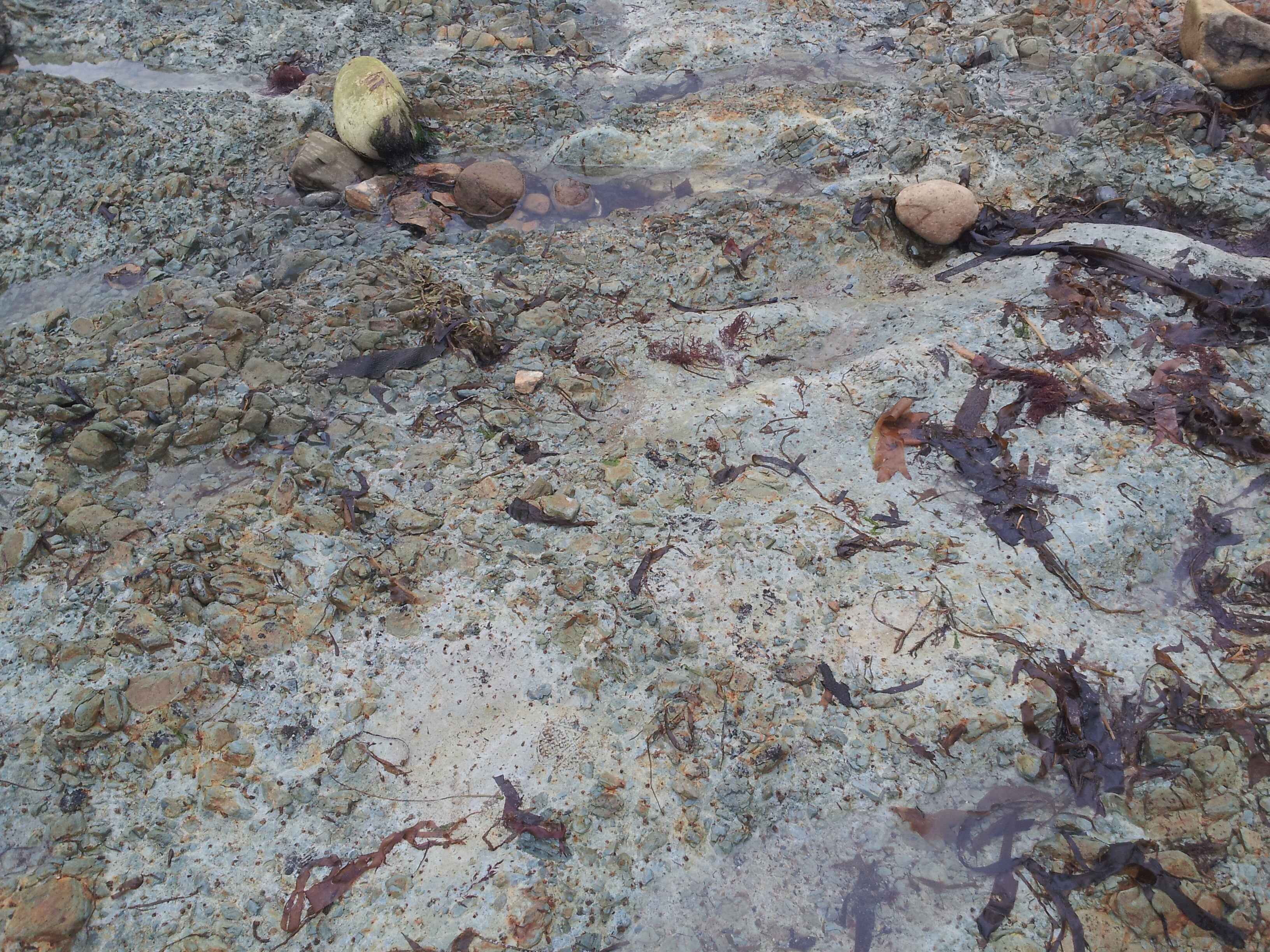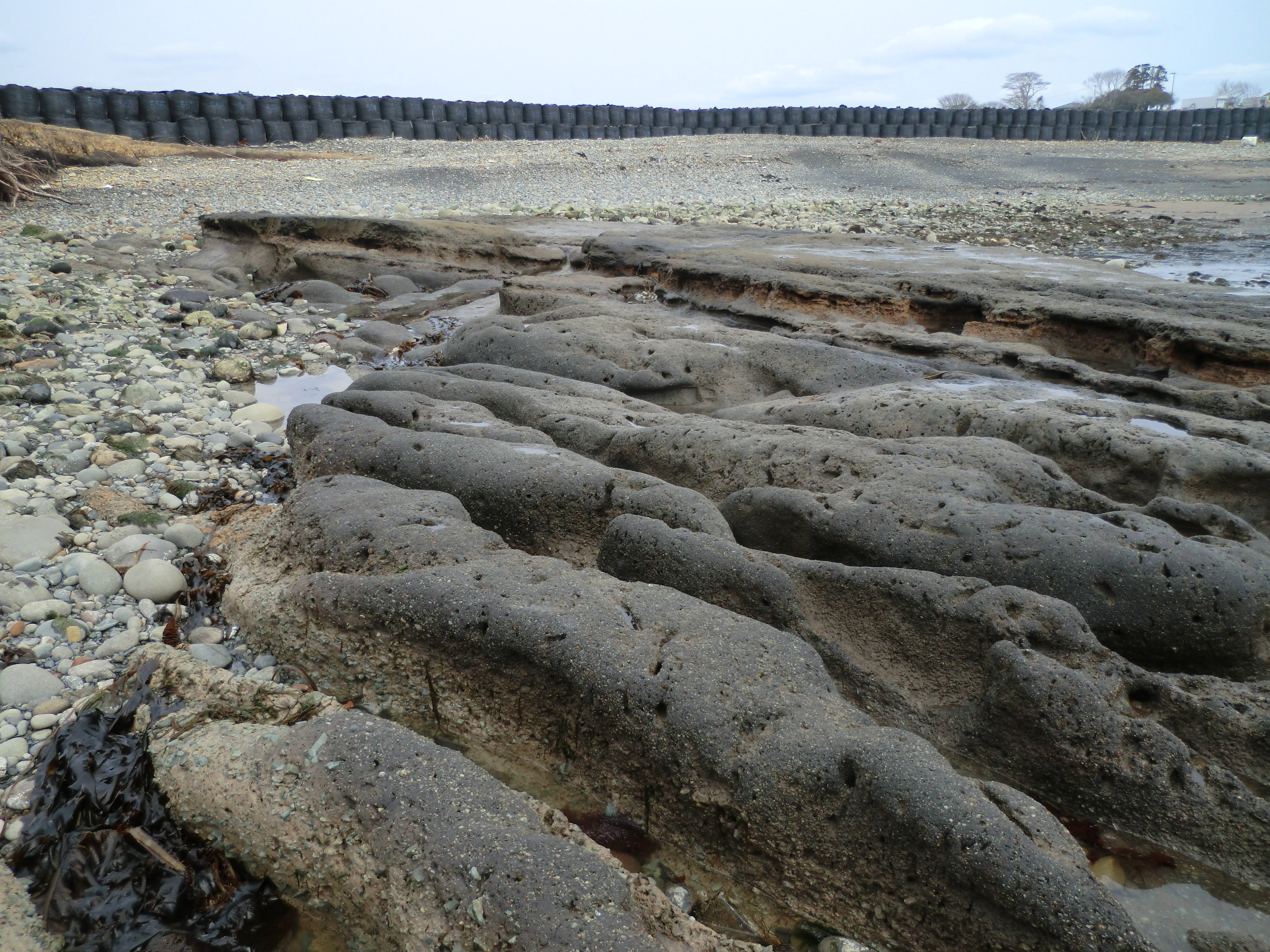 遠 景 近 景 ↑ 粘土化 右側(奥)は亀裂の発達した硬質な砂岩・泥岩(シルト岩)であり、手前は熱水変成により 粘土化したものと考えられる。見かけは岩盤状であるが、指が突き通るほど軟質である。 海岸には、砂岩・泥岩に取り込まれていたと考えられる円礫が堆積している。