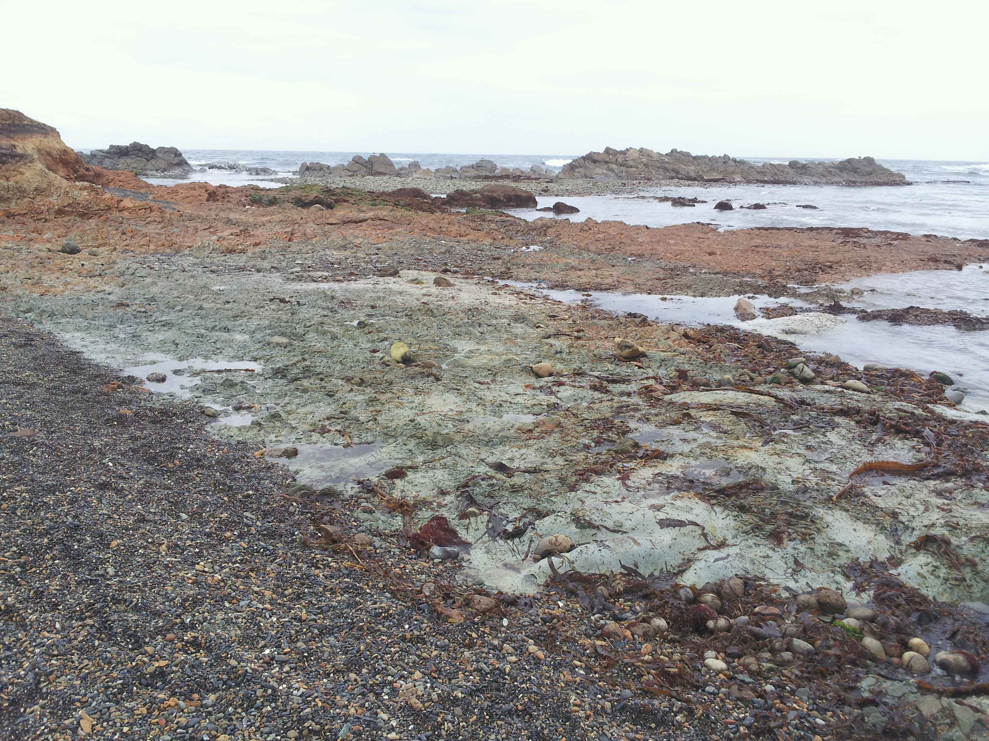 津波被災により自然の海岸が戻った 津波被災により、人為的に手を入れたものが流され、 自然の海岸がもどった。 この点については、津波直後より指摘し、自然に戻った海岸を保全しようと呼びかけてきた。 その一貫として、震災瓦礫を活用した緑の防波堤・多目的防災林を自然海岸の背部に造成し、 築堤の森と海岸を結ぶエコトーンを造ろうと提案をしてきた。 この自然の海岸の変化を見守り、観察を続けようと言うことで、気仙沼市大谷在住の小野寺 雅之氏の要請により、平成24年5月11日、海岸エコトーンに関する環境学習を実施した。 対象は大谷中学校の2年生、午後の2時間をあて、1時間目は海岸へ出て観察、2時間目はパ ワーポイントを用いての座学である。 朝から雨模様であったが、海岸へでる時には雨が上がり、海岸の地質・土壌などについて観察 した。 海岸の地質状況 海岸には、古生層とみられる泥岩とその熱水変成による粘土層が出現しており、柔らかな粘土 層が海食により短期間で変化する様が見受けられる箇所である。 この粘土が、海水中へミネラルを補給するためか、当地域の海草の生育はすこぶる旺盛である。 ↓ 泥岩![]()