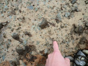 海食を受ける粘土層 指が入るくらい柔らかな粘土層 粘土層の中に円礫が認められる