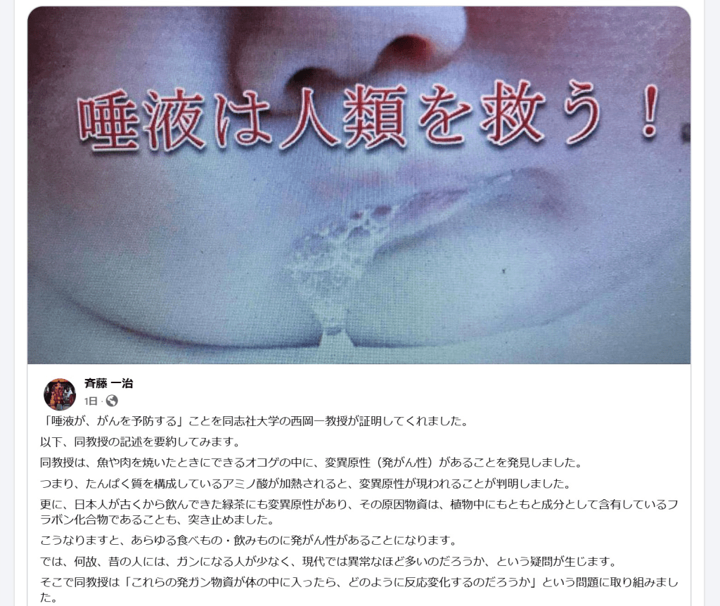 > 発癌性物質が口の中に投入した人間の実態を検証するために様々な発癌性物質に唾液を混入するといった実験は著名であり発癌性物質の毒性は唾液に約30秒間に混入するだけで消失したことで唾液の酵素が発癌性物質の変異原性を抑制することが証明された(Wikipedia 西岡一)。