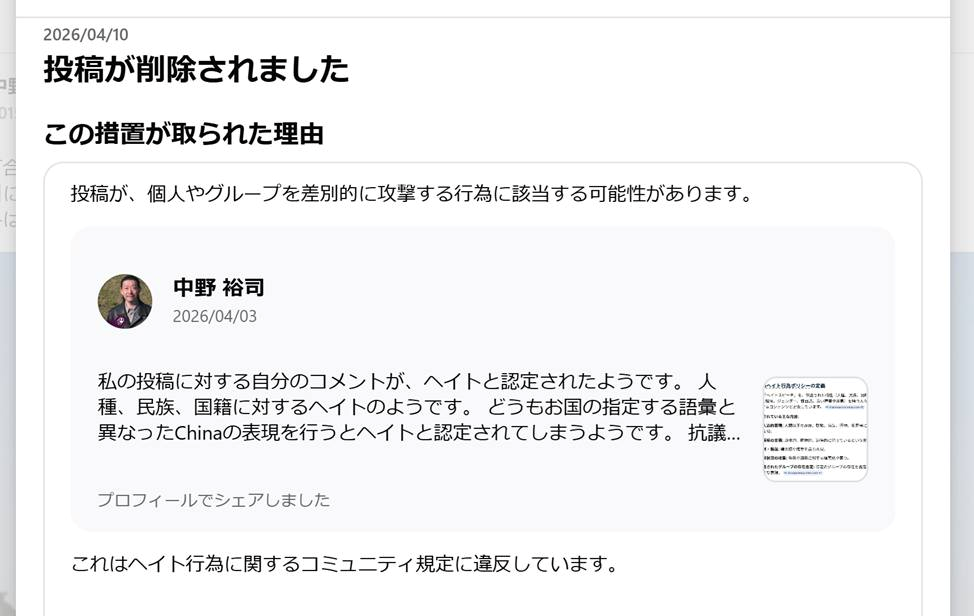 ご報告と、ヘイトに関する注意喚起。またまた私の投稿がメタAIのご注意を受けてしまいました。