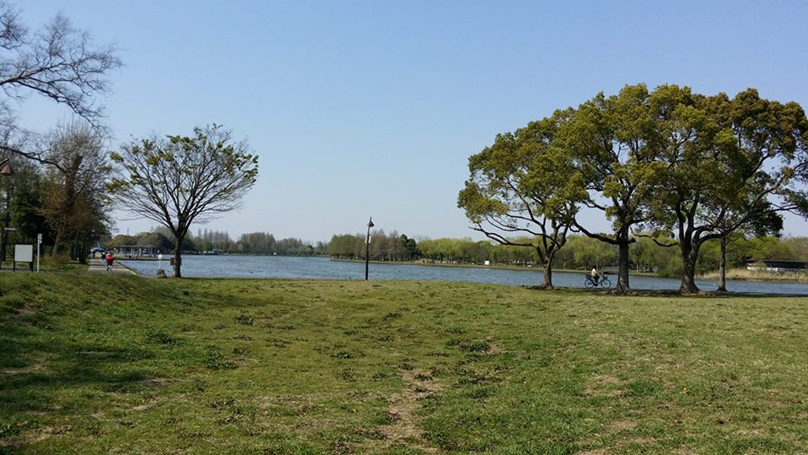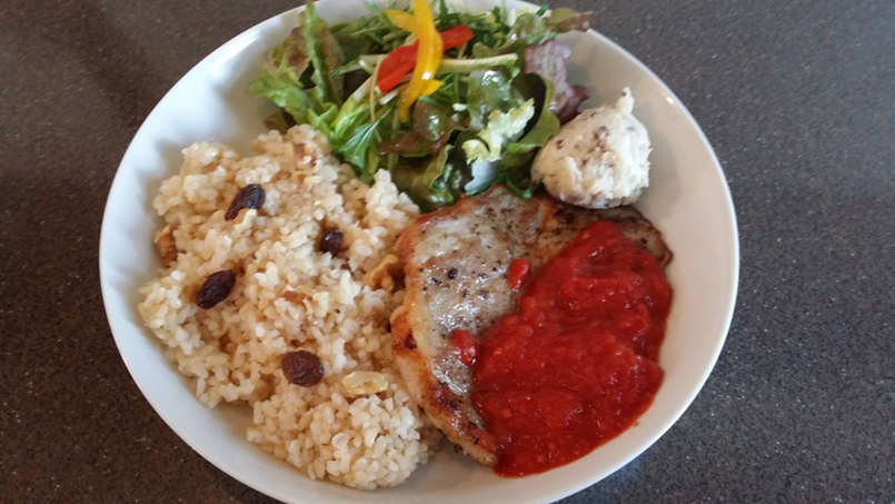 「宮崎直送豚ロースソテートマトソース」という長い名前の朝ご飯です。水元公園、歩行訓練の途中。