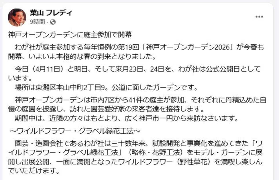 私の発明の「グラベル緑化工法」を神戸・関西という土地柄に合わせて改良し実施してくれました。