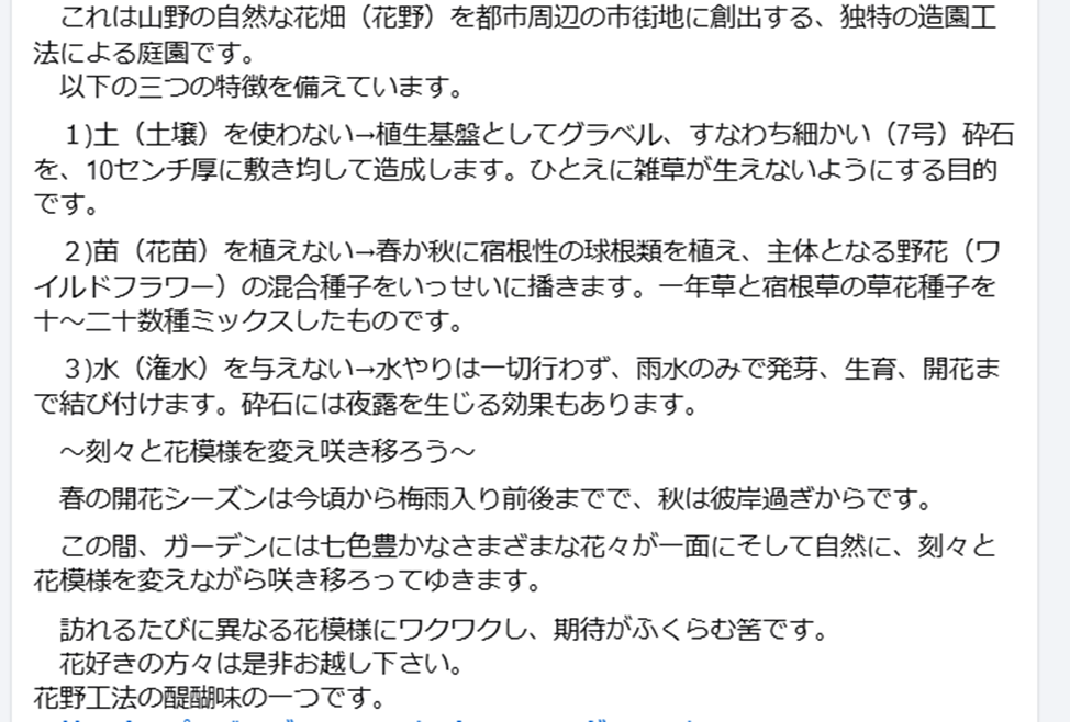 グラベル緑花工法は、除草など行わなくても草花群落が維持できるようにずいぶん前に開発したものです。